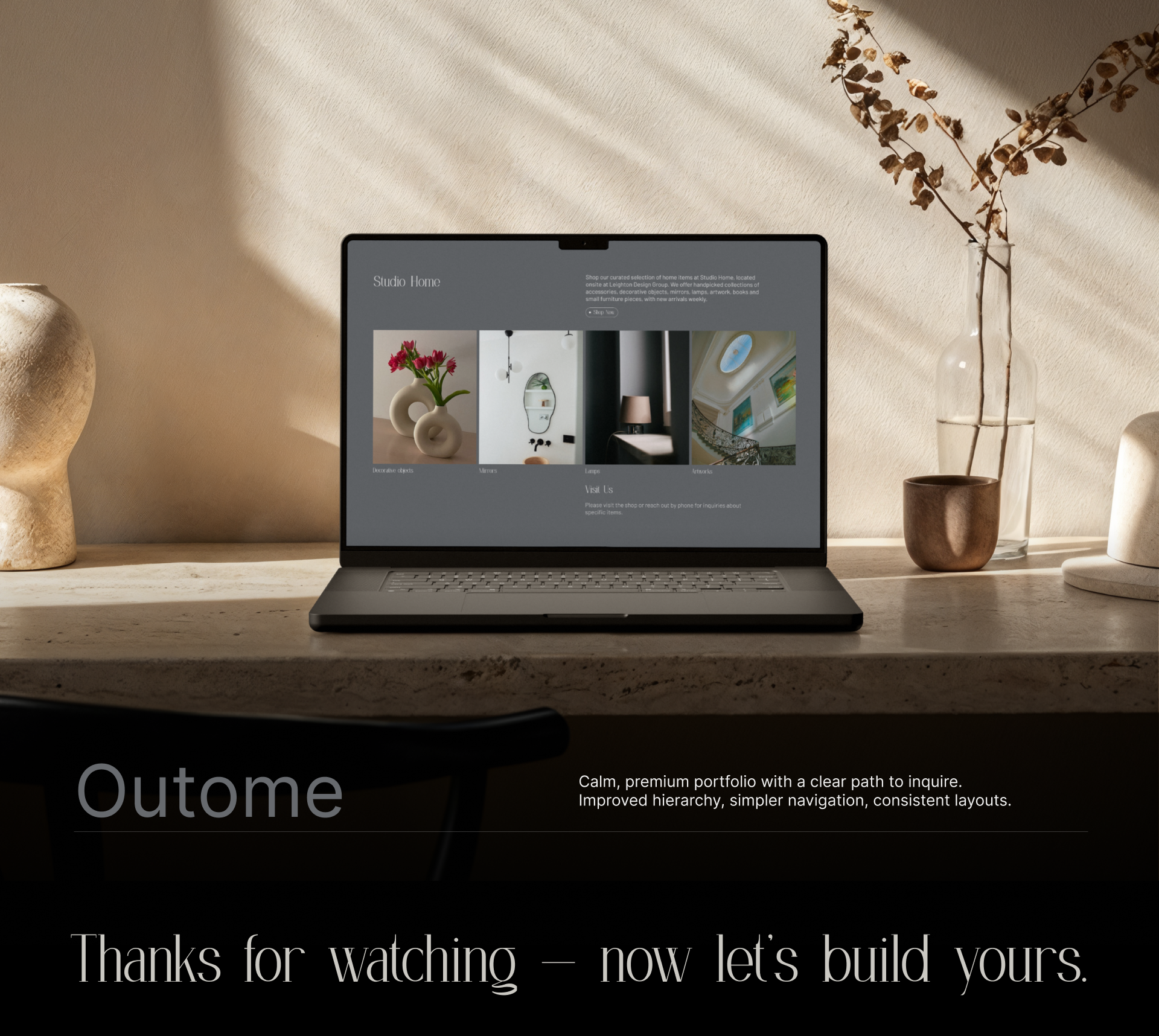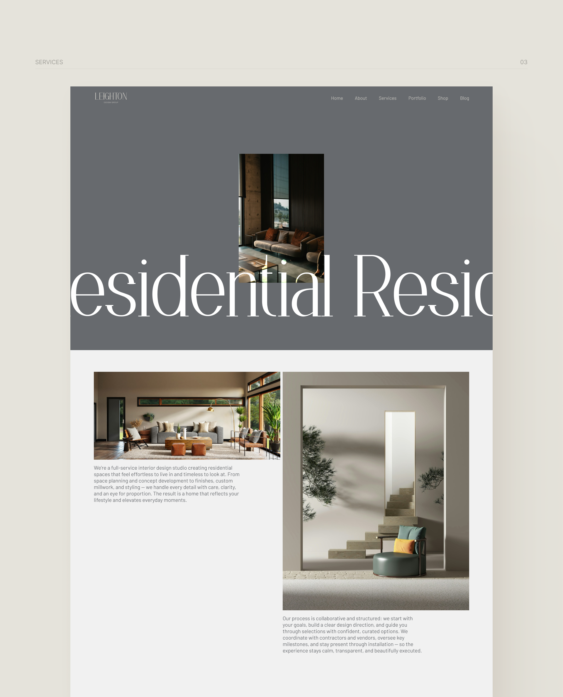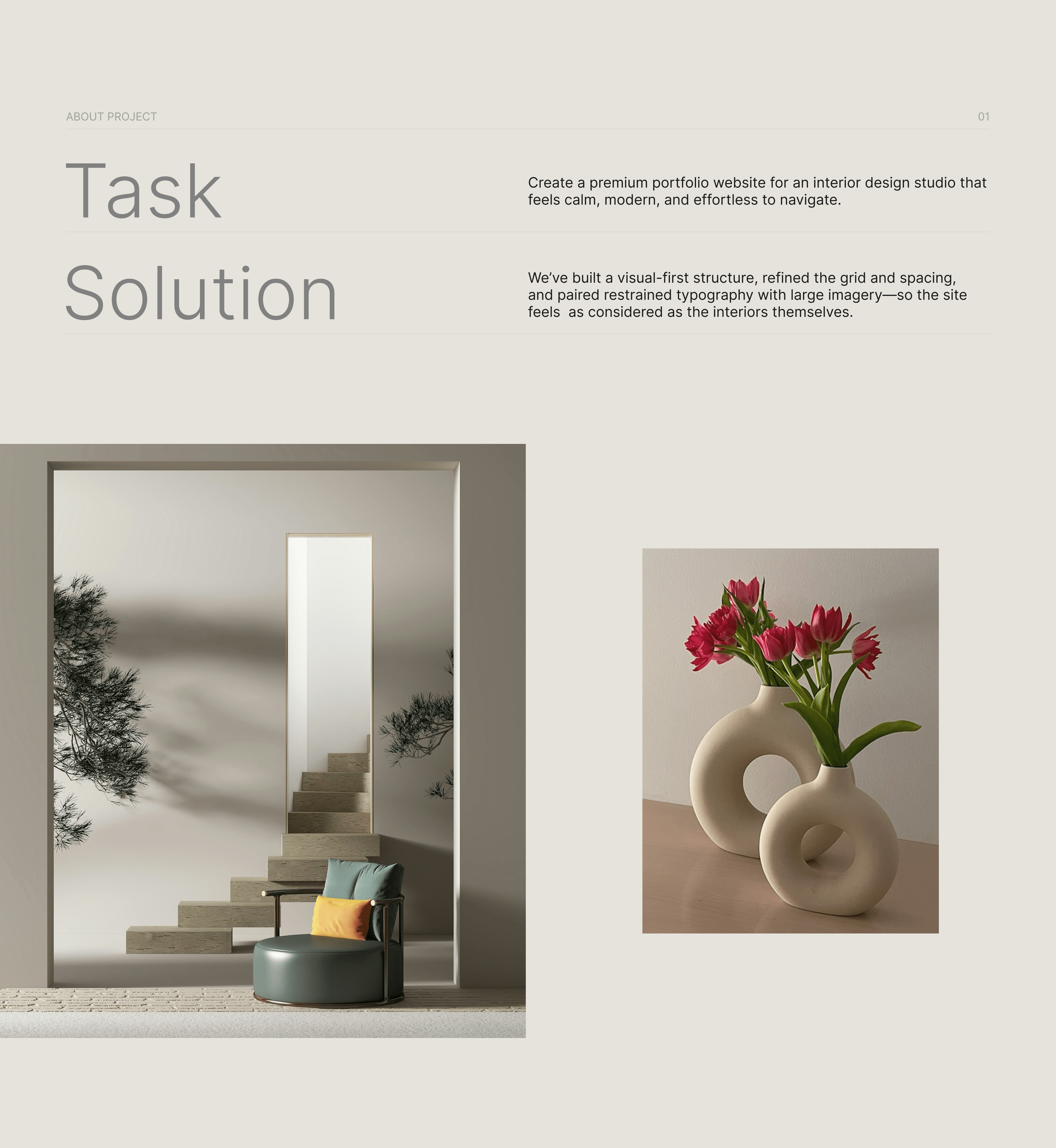 This project showcases a premium portfolio website concept for an interior design studio — designed to feel calm, modern, and effortless to navigate. My goal was to create a digital presence that reflects the studio’s refined aesthetic and design philosophy while prioritizing clarity, usability, and responsive performance.